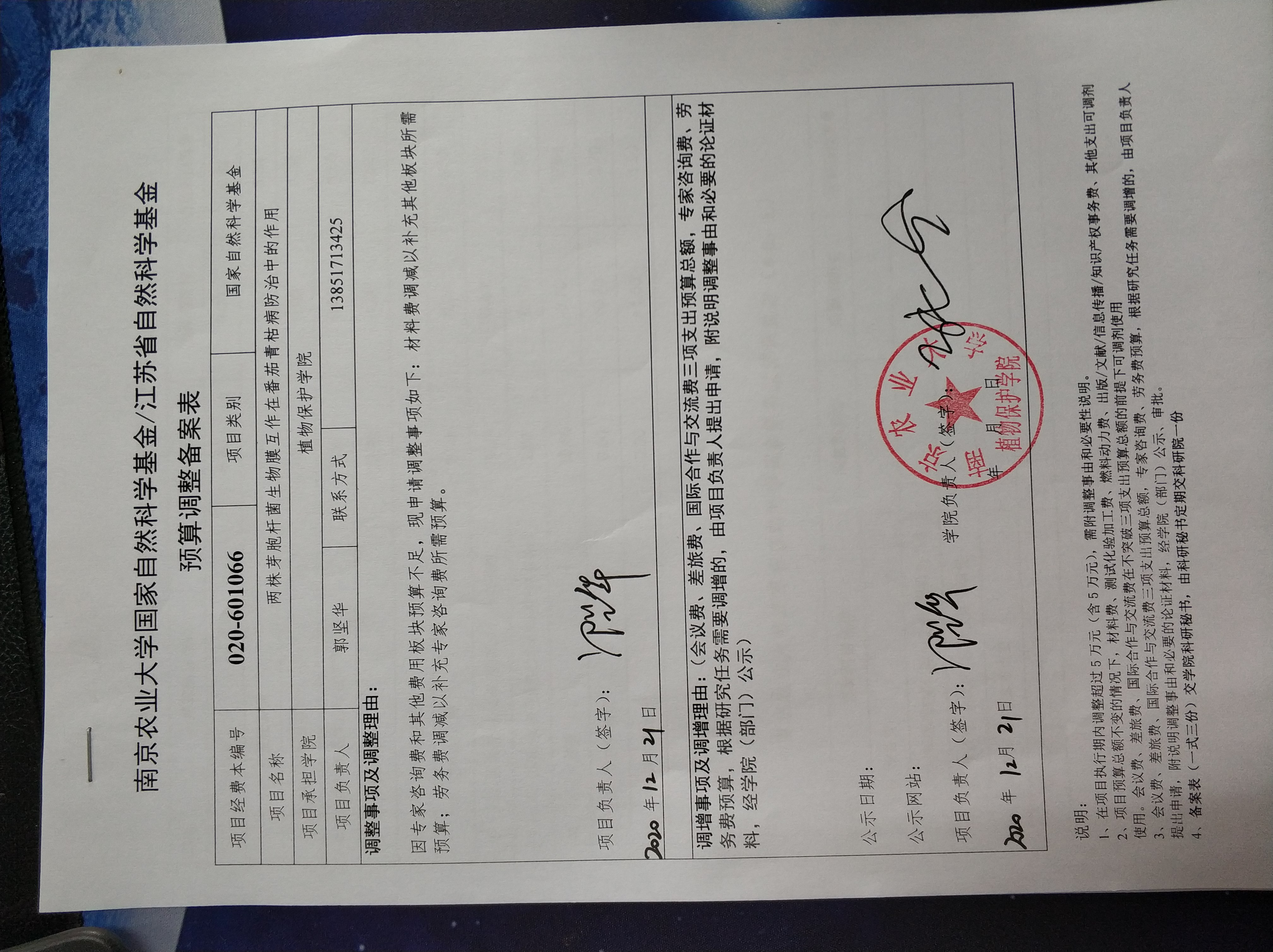公示:国家自然科学基金“两株芽胞杆菌生物膜互作在番茄青枯病防治中的作用”预算调整