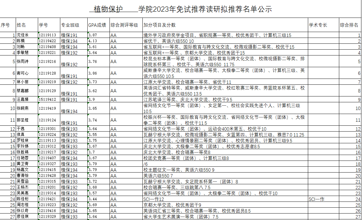 2023年推荐免试研究生(含“直博生”)工作方案》综合排名,现将最终拟推荐名单公示如下(按综合成绩排名排序):