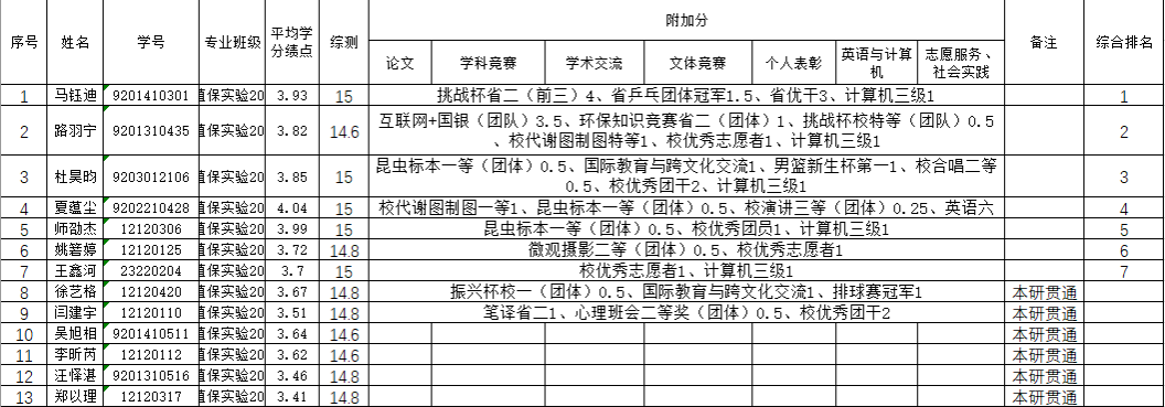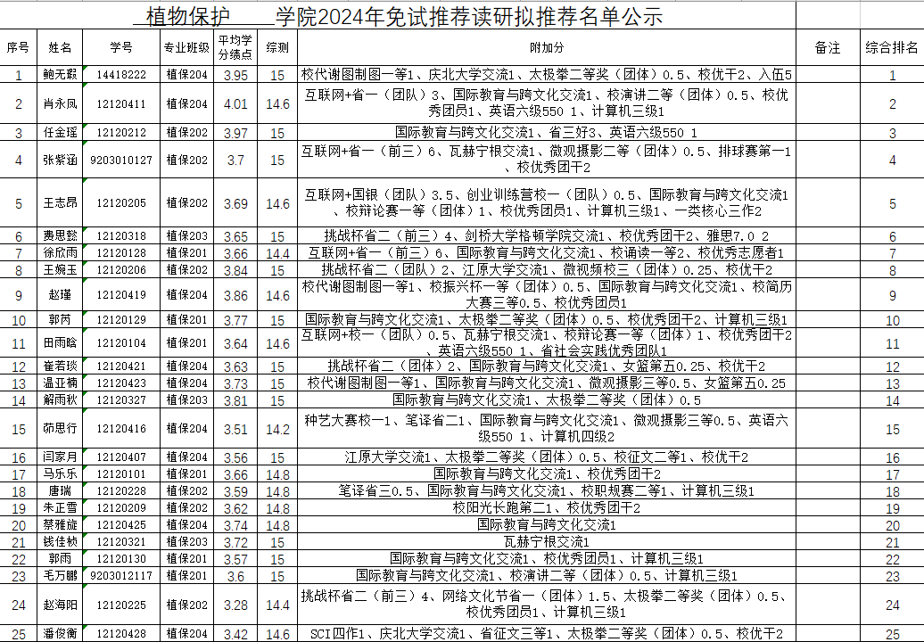 2024年推荐免试研究生(含“直博生”)工作方案》综合排名,现将最终拟推荐名单公示如下(按综合成绩排名排序):
